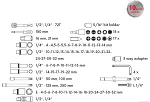 Kvalitní gola sada je vhodná díky kvalitě použitých materiálů a zpracování v profesionální autodílně nebo servisu. 10 let záruka. Všechny části jsou vyrobeny z vysoce kvalitní chrom-vanadiové oceli. Niklová povrchová úprava. Hroty bitů jsou ze slitiny oceli S2. Ráčny mají jemné dělení 72 zubů, tělo ráčny z CrV oceli, zubový mechanismus z S2 oceli, ergonomicky tvarovanou rukojeť se zdravotně nezávadnou gumou. Nový design plastového kufru z primárního materiálu s kovovými uzávěry a panty víka.