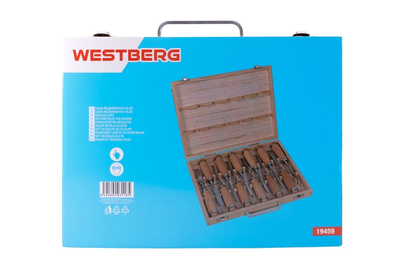 Carving chisels 12 pcs in a set. Chisels sold in a wooden case. Different blade shapes. Chisels with an ergonomic handle made of beech wood, striking surface with a metal ring that increases its strength.