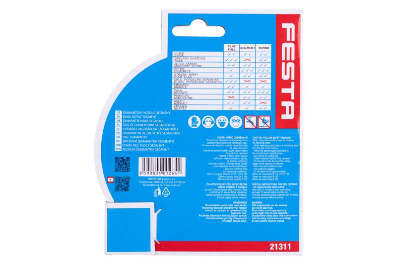 FESTA professional diamond blade, design: SEGMENTED, high-quality materials and processing - high-strength attachment of the diamond segments to the supporting disk of the blade, high content of diamond dust in the segments, use: for dry cutting of concrete, brick, masonry, stone, ..., packaging: blister with euro hole, dimensions: stated in the product name.