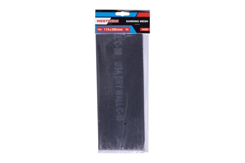 Sanding grid 115 x 290 mm, grain size 80, 3 pcs/set with euro hole, carrier fabric made of glass fibers, resin-glued silicon carbide sanding grains coated with antistatic, suitable for sanding plasterboard jointing compounds and other materials, the advantage of the grid structure compared to ordinary sanding papers is in that it is not clogged with ground material.