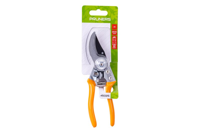 Gardening aluminum scissors with lock and two high-quality steel blades are inserted into the aluminum frame of the scissors. The garden scissors have a special adhesive plastic coating on the handles to prevent the scissors from slipping out of the palm. Total length 20 cm.