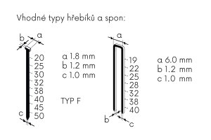 - szegezés gyakorisága 60 - 100 perc-1, a klipek/szegek javasolt maximális hossza 50 mm (kemény anyagok esetén 30 mm), tömeg akkumulátor nélkül 2,7 kg