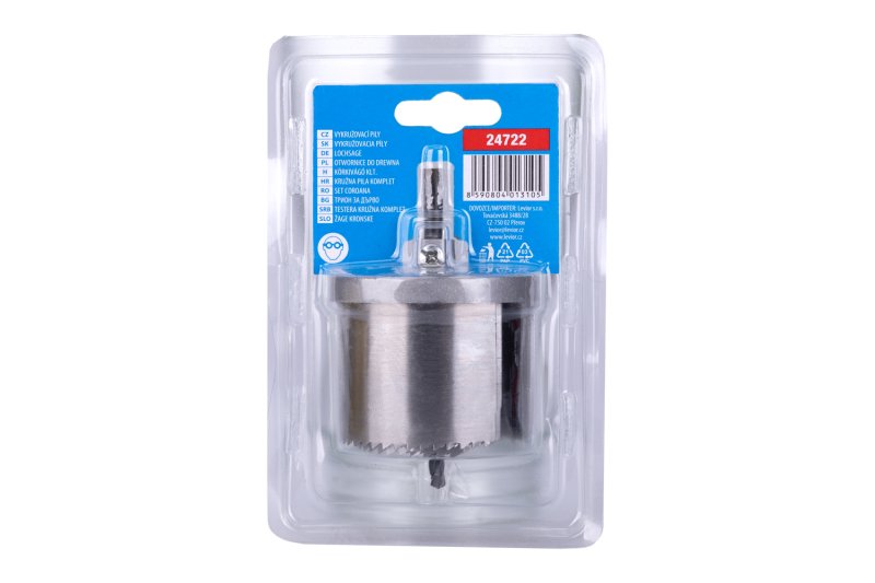 Sada vykružovacích pil do dřeva, sádrokartonu, dřevotřísek apod., s upevněním do vrtačky. Sada obsahuje 7 kusů pil o průměrech 26, 32, 38, 45, 50, 56 a 63 mm.