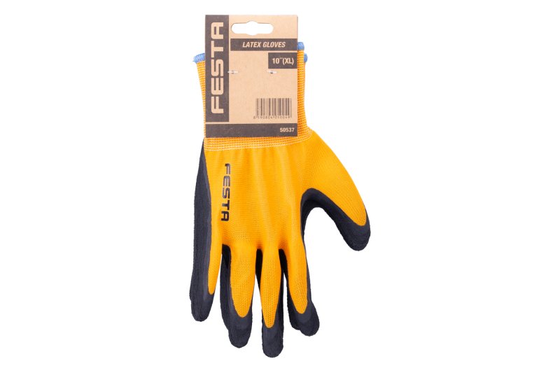 Oranžový úplet z jemného nylonovu, dlaň máčena v černé latexové pěně, CE EN 388, velikost 10.